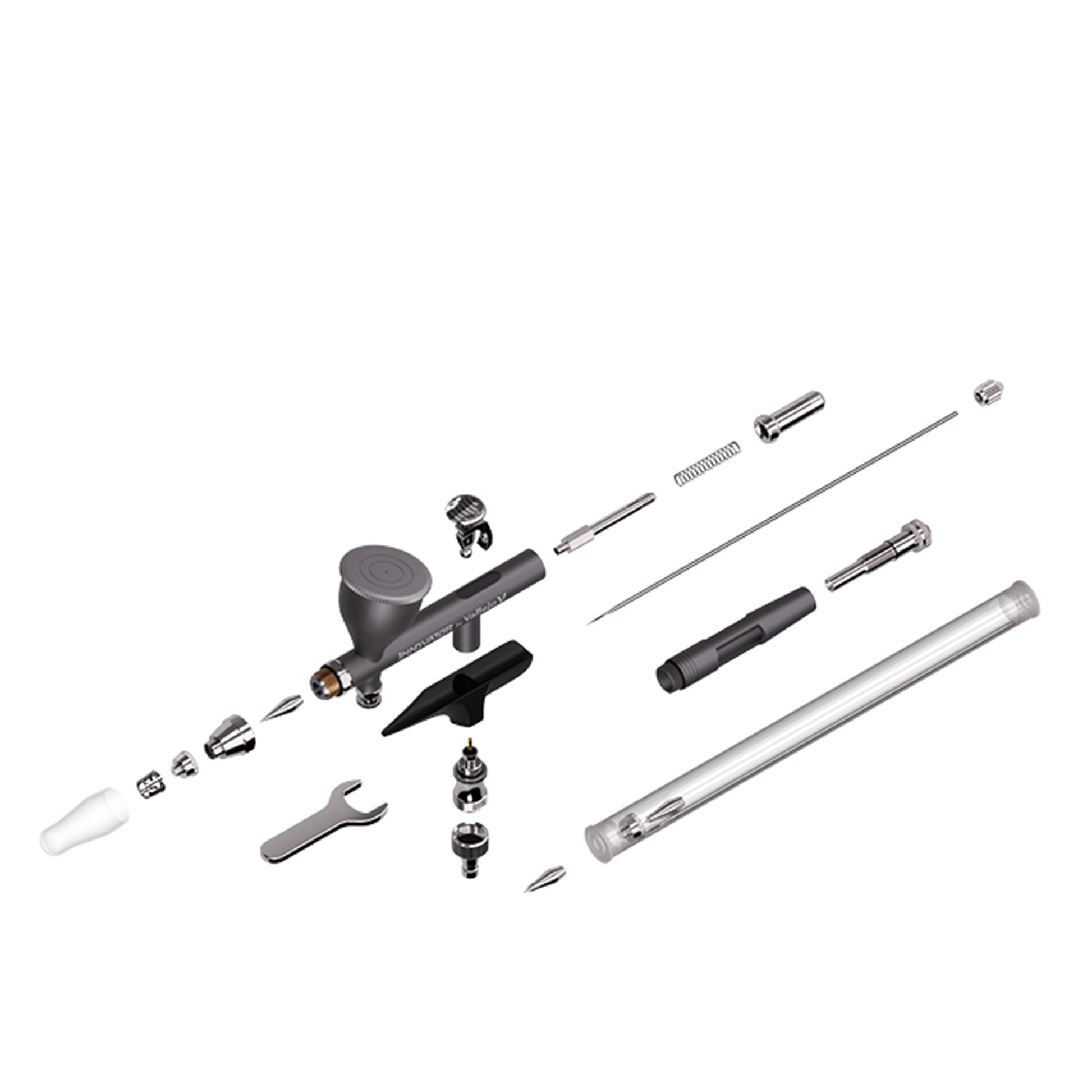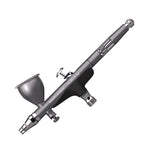 A unique ultra-light alloy model. An ergonomic and original design, offering both needle travel regulator and air flow and pressure regulator, providing absolute control in detail and precision work, the perfect tool for professionals. Features an intuitive independent dual-action function by gravity system and a floating nozzle system. Easy to disassemble and clean. Includes a needle/nozzle set of 0.2 mm and 0.3 mm, a 9 ml cup and a quick connection sleeve to the hose.