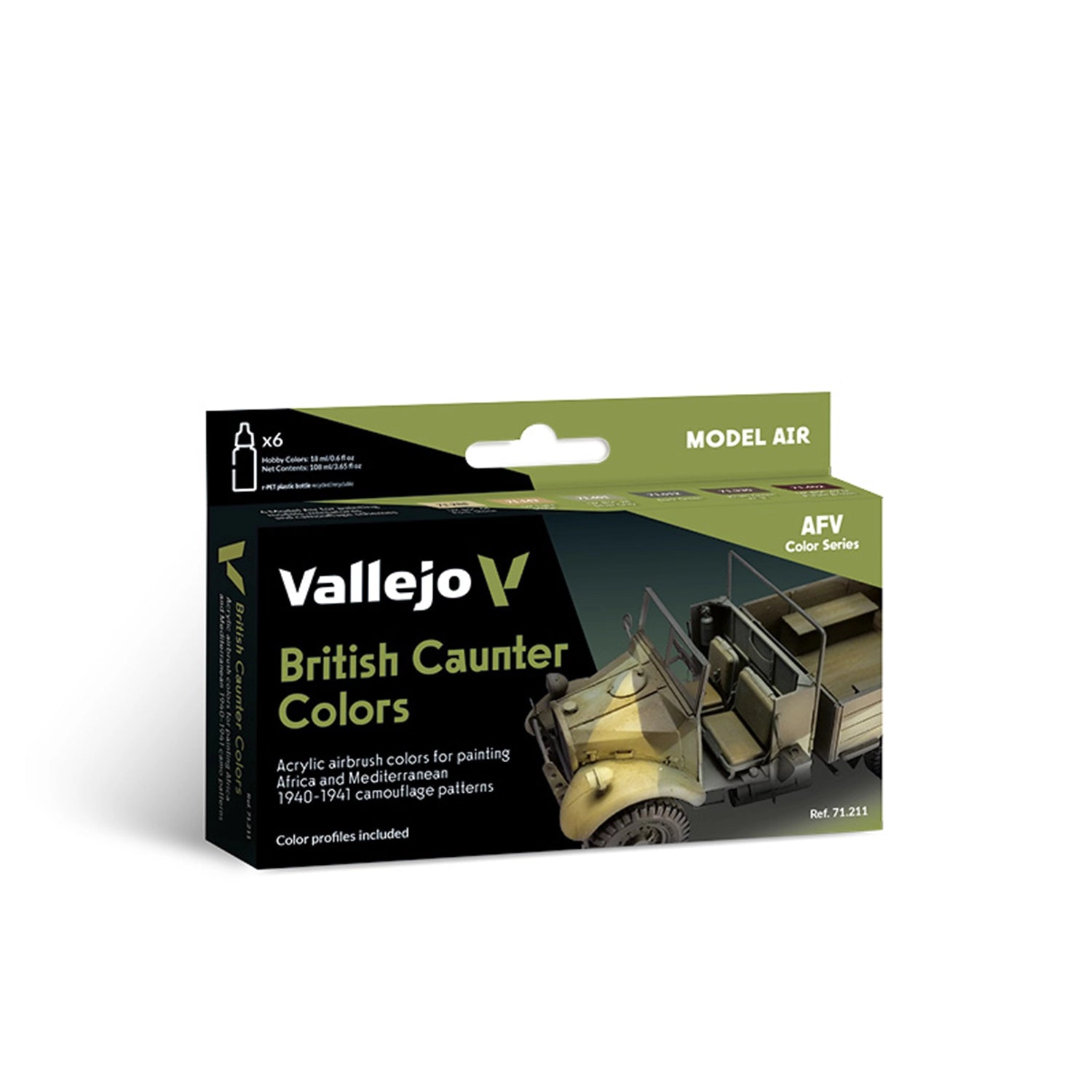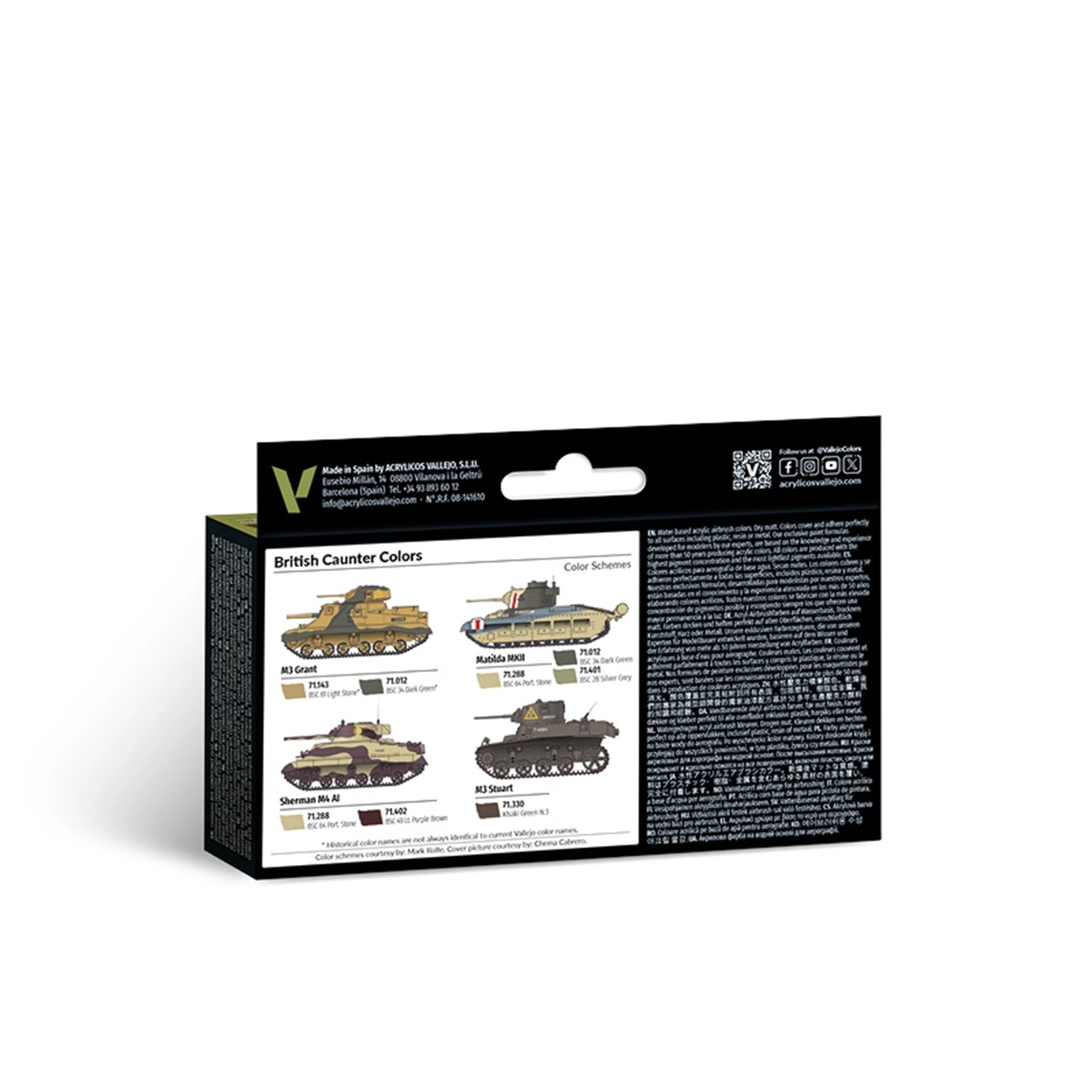This set contains the colors for the application of the well know British Caunter Camouflage scheme on AFV vehicles, as well as other equipment included in this new ordinance for disruptive camouflage. The colors have been developed especially, following the historical references given in thebook by M. Starmer. Also included are the references Purple Light Brown and Light Stone used for the two-tone camouflage scheme.