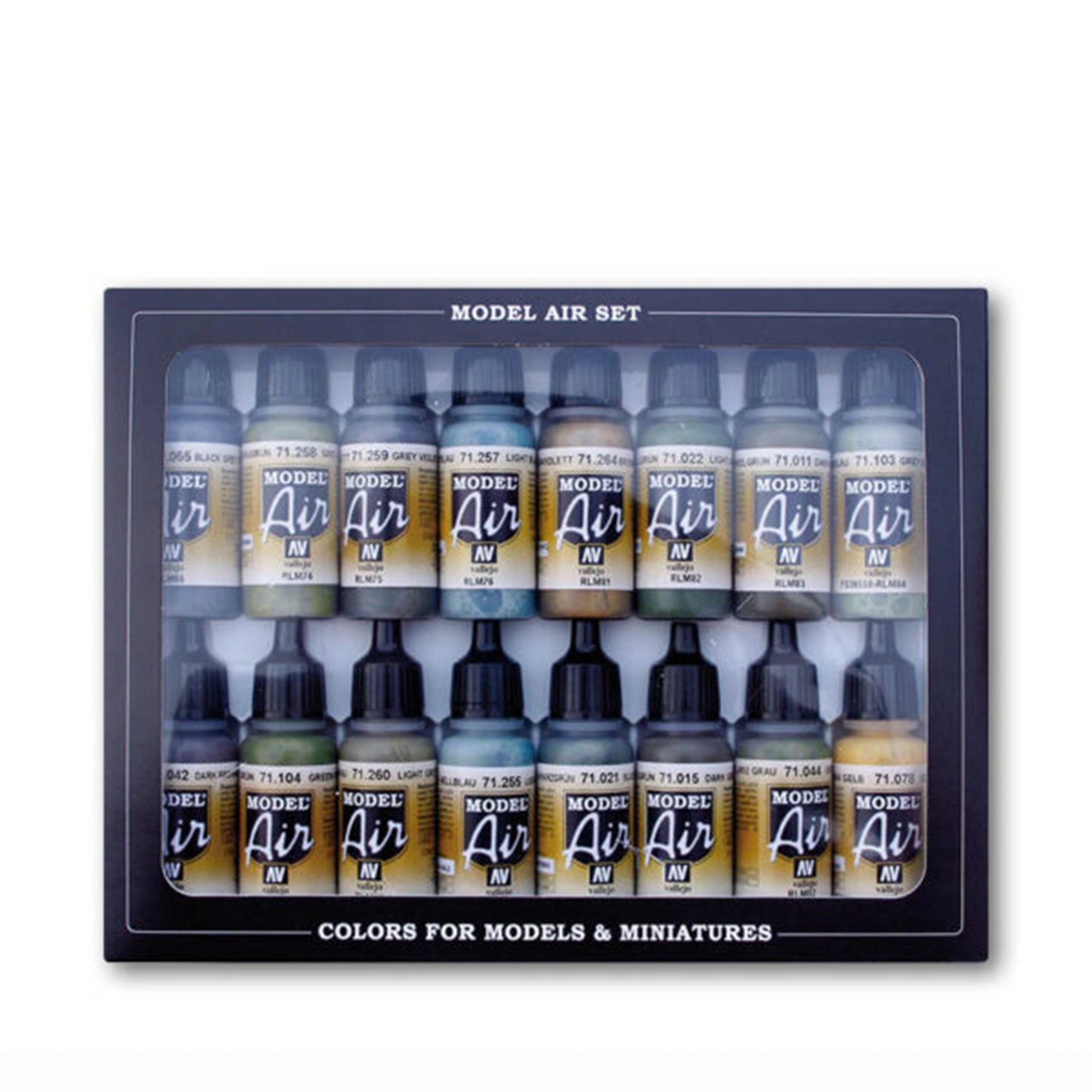 Set of 16 Model Air references for painting models, figures and dioramas. Contains 17 ml./0.57 fl.oz. (with eyedropper) bottles and a color chart.