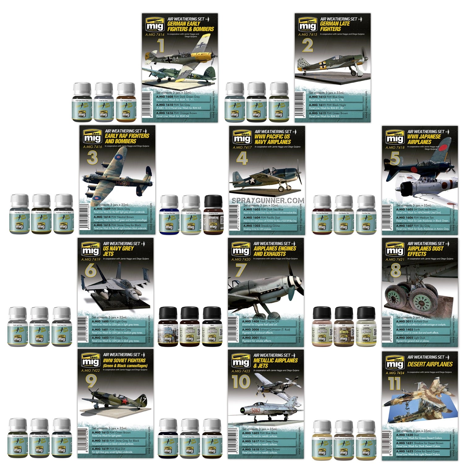 Each set features solvent-based enamel washes and/or pigments, optimized for aircraft surfaces and finishes, and includes targeted tones for historically accurate finishes across multiple nations and time periods.