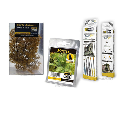 - Dioramas: This section contains all the AMMO by Mig items useful for creating dioramas and vignettes, such as vegetation, textures, materials for dirt, water, snow, resin, and more.