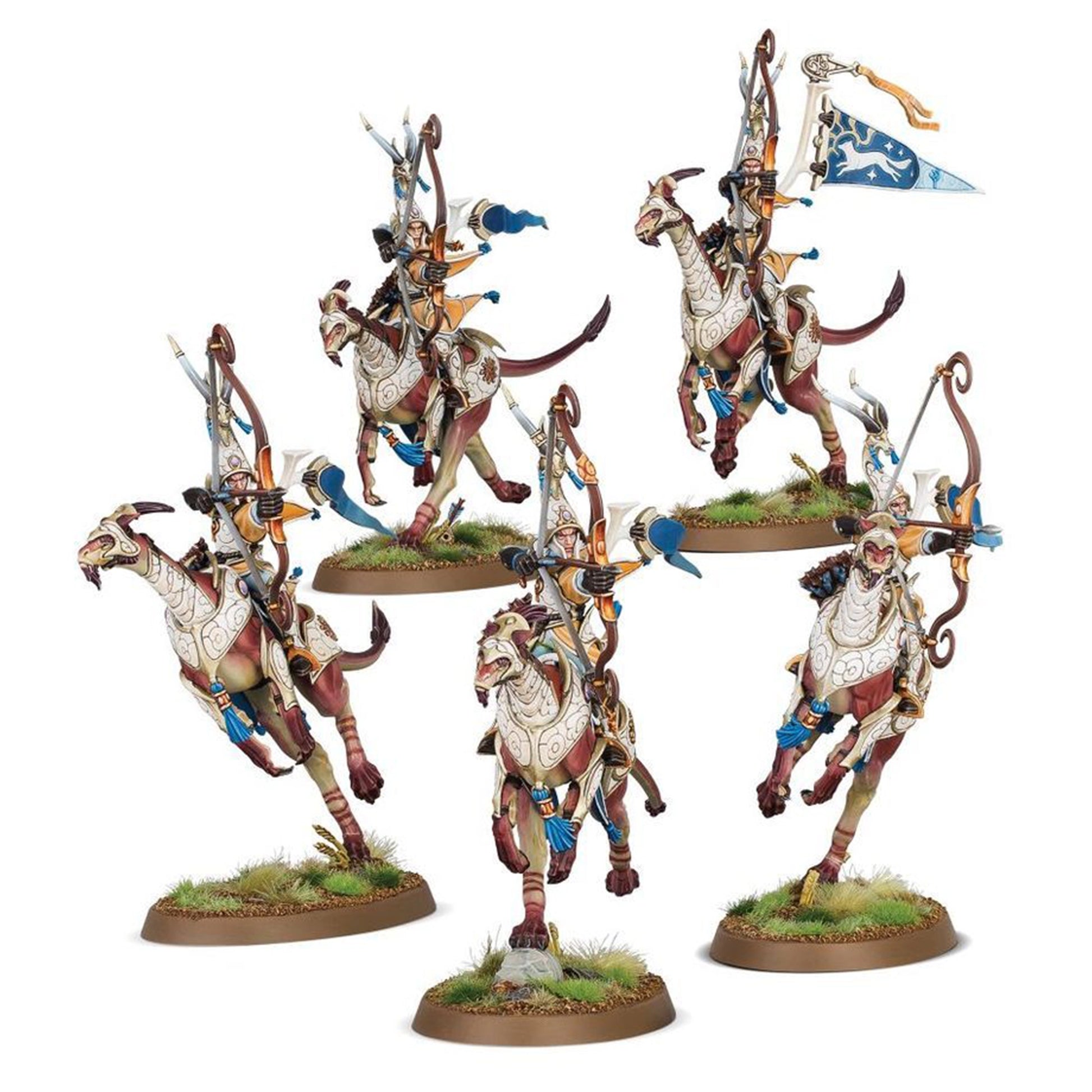 Buoyed aloft by the vigour of the wind, the Hurakan Vanguard protect the borders of Lumineth territory with the swiftness of a speeding zephyr. Through their bond with the air, these devoted warriors of Hysh fight within the heart of a hurricane. Its powerful currents carry the aelves and lend their arrows greater strength, while enemies caught within the swirling tumult are completely outmanoeuvred and picked apart.