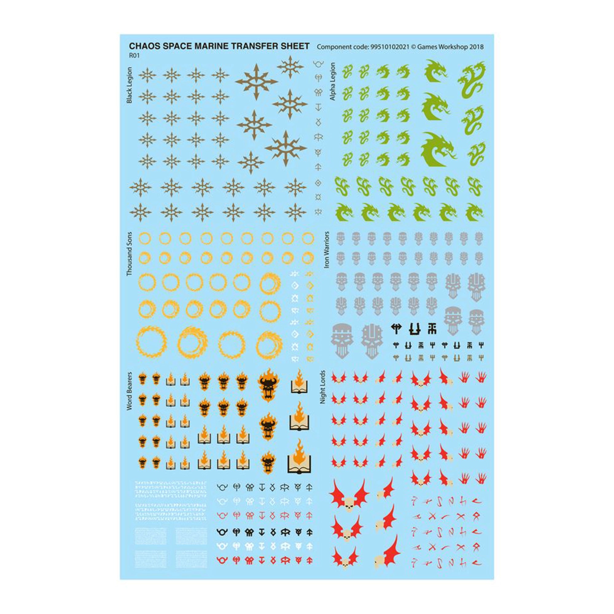 The kit also includes 2x Chaos Space Marine Transfer Sheets, each containing 364 high-quality waterslide transfers. These feature symbols for the Thousand Sons, Black Legion, Word Bearers, Iron Warriors, Alpha Legion, and Night Lords, along with generic icons relating to the different Chaos gods.