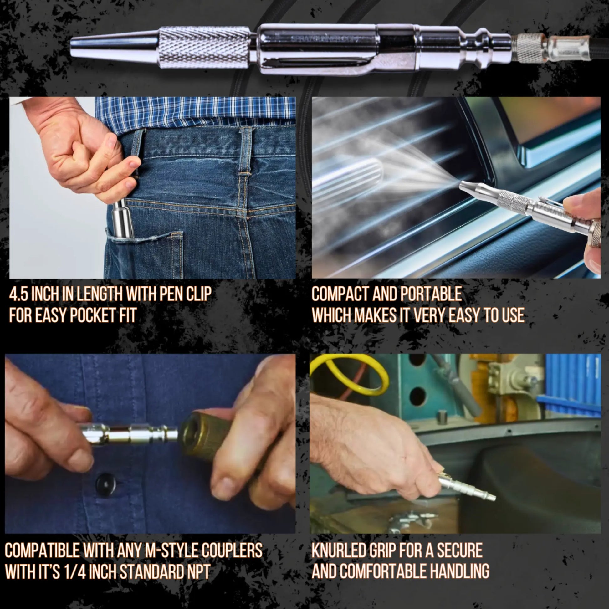 Clip it, twist it, blast it—this NO-NAME "Milton" Brand Pocket Air-Blower is the perfect tool for quick cleanup and precision air bursts. With its slim, pen-style clip, this compact blow gun fits easily in your pocket or tool belt, always within reach for dusting workspaces, prepping scale models, or cleaning tight areas.