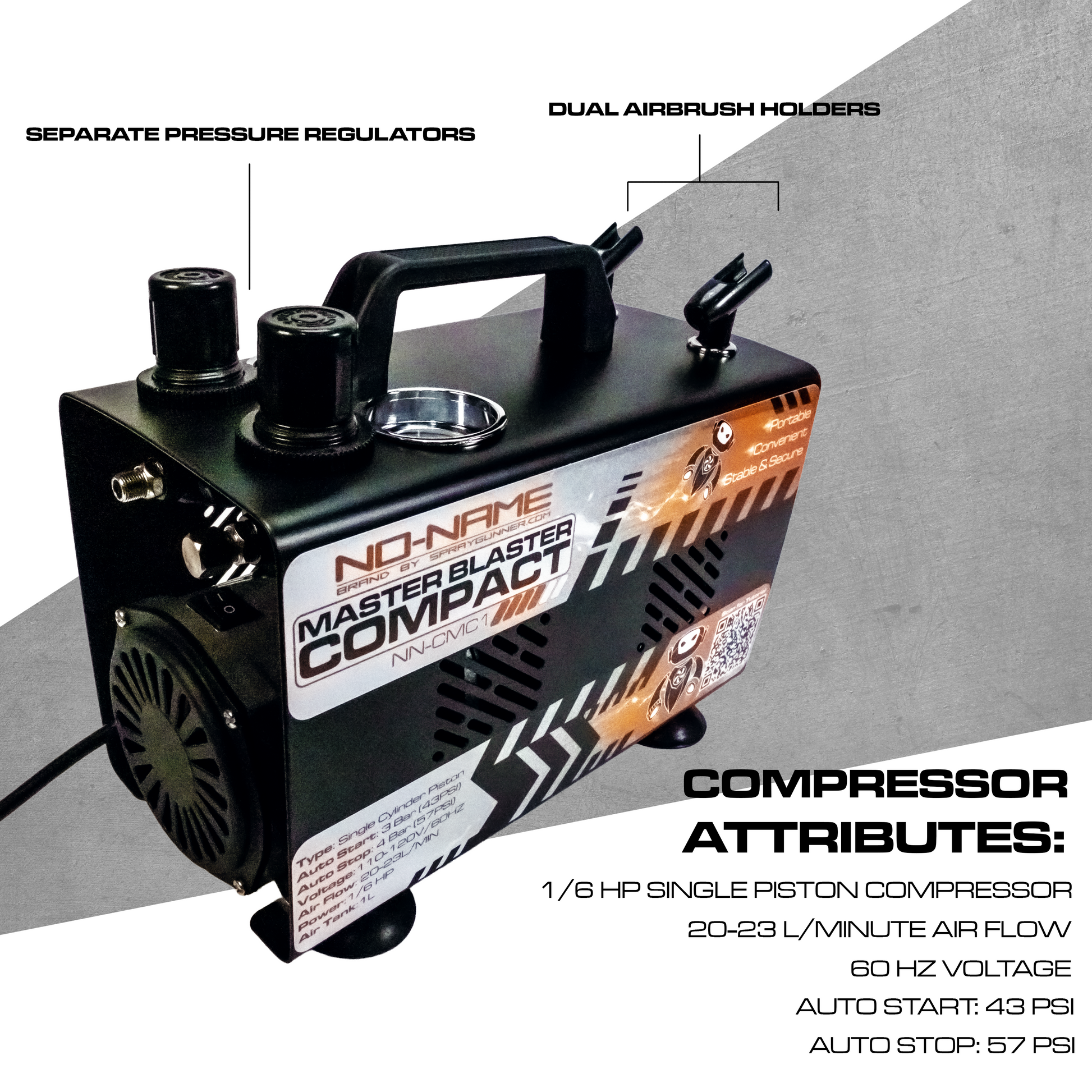 Engineered for versatility, stability, and power in a compact design, the Compact Master Blaster Airbrush Compressor by NO-NAME Brand is your all-in-one solution for professional airbrushing performance. Whether you're working in cosmetics, nail art, tattoo design, illustration, scale modeling, or custom lures, this compressor delivers reliable, steady airflow for clean, consistent results.