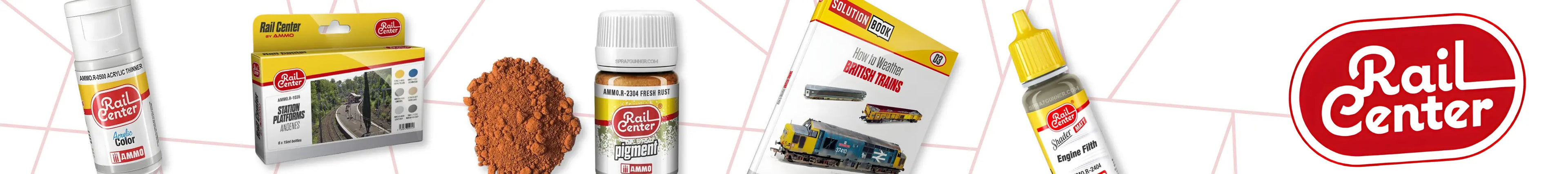 Rail Center Weathering products by AMMO by Mig Jiménez are designed to bring true railway realism to your layouts, locomotives, and rolling stock. Available at SprayGunner, this range includes pigments, nature effects, streaking products, enamel effects, and complete Solution Books that help you recreate grime, rust, dust, and operational wear seen on real trains and infrastructure.
