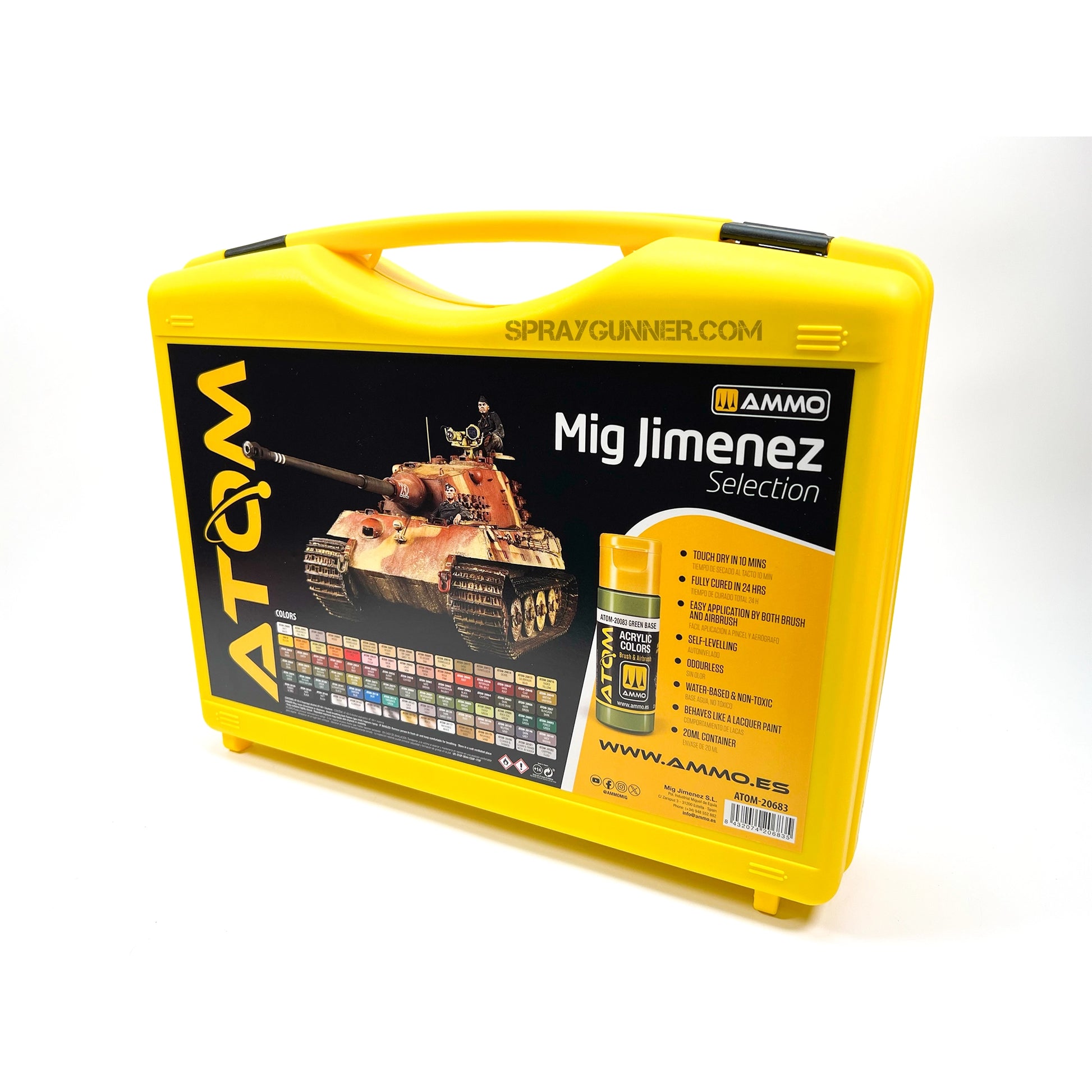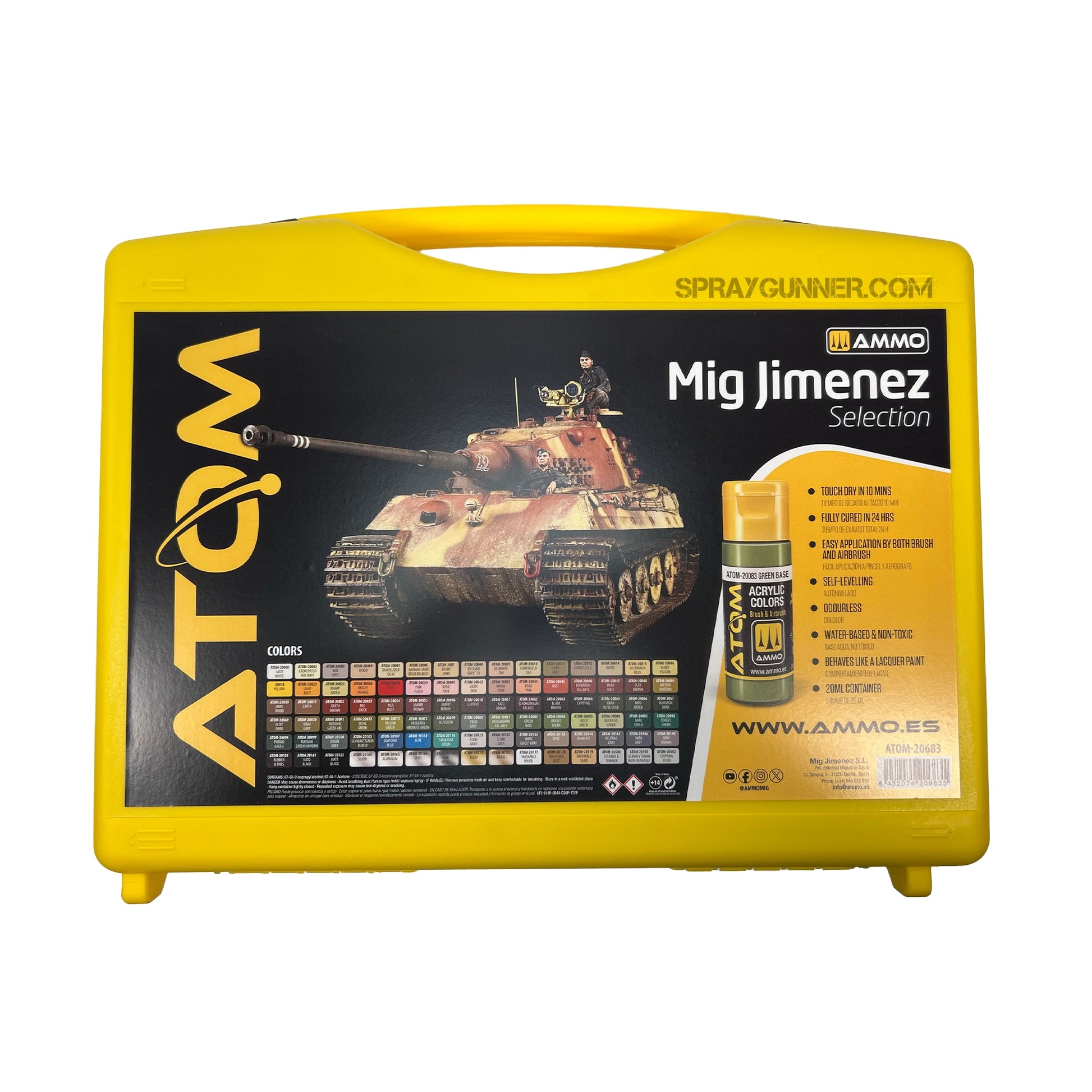 This case contains the 88 ATOM colors most frequently used by Mig Jiménez in his modeling projects. ATOM SELECTION: MIG JIMÉNEZ includes 88 colors and 3 auxiliary products: ATOM-20502 ATOM Chipping Effect (20 ml), ATOM-20501 ATOM Thinner and Cleaner with Retarder (20 ml), and ATOM-20500 ATOM Thinner and Cleaner (20 ml).