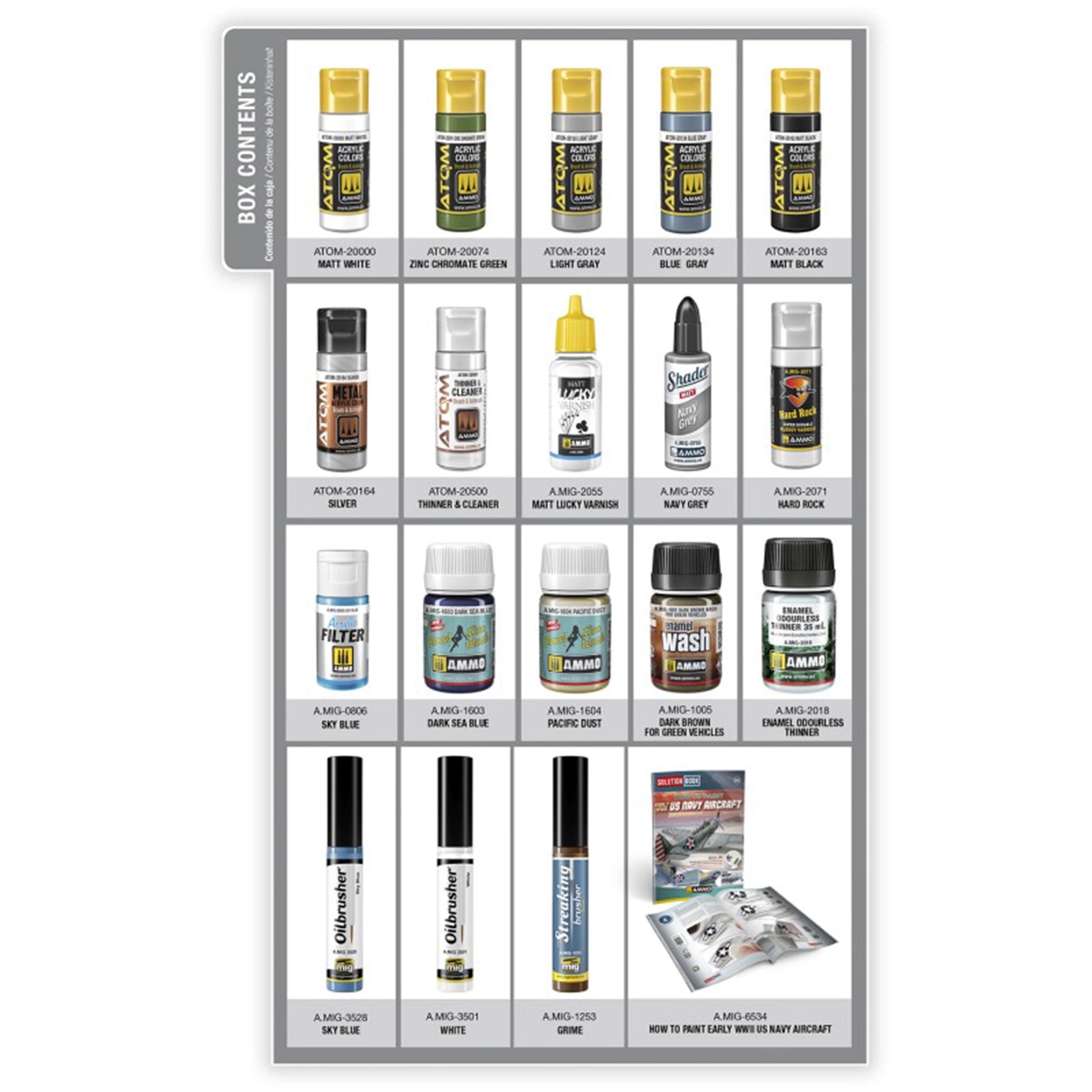 In this SOLUTION BOX, you will not only find the necessary colors, varnishes and weathering products to paint any U.S. Navy aircraft with early Second World War camouflage, including the iconic F4U Corsair, F4F Wildcat, TBD-1 Devastator, TBF/TBM Avenger, SBD Dauntless, and many others; it also includes the valuable resource Solution Book: How to Paint EARLY WWII U.S. NAVY AIRCRAFT. This simple 67-page guide contains explanatory texts in four languages (English, Spanish, French, and German). The model used as an example in this Solution Book is the Douglas TBD-1 Devastator in 1/48 scale by GWH.