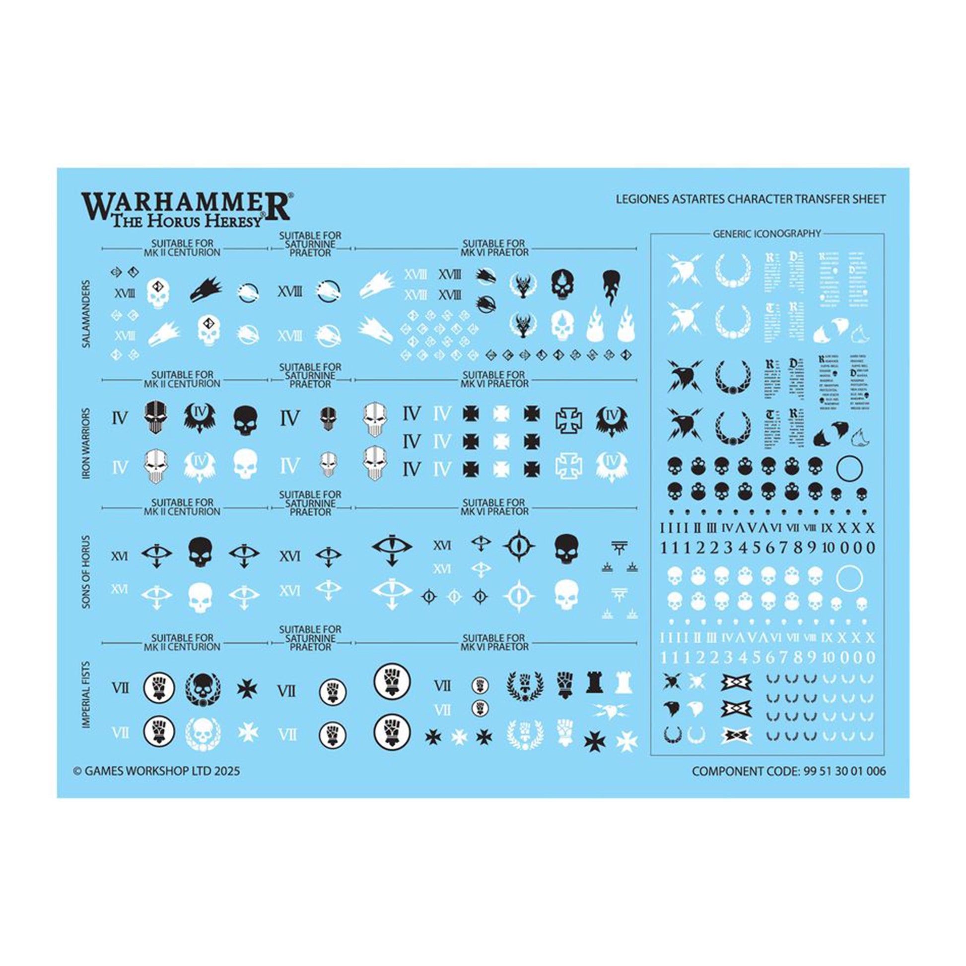 This kit comprises 78 plastic components, 1x Citadel 50mm Round Base, and 1x Legiones Astartes Character Transfer Sheet containing 339 high-quality waterslide transfers – featuring Legion iconography for the Sons of Horus, Imperial Fists, Iron Warriors, and Salamanders – to decorate your miniatures.