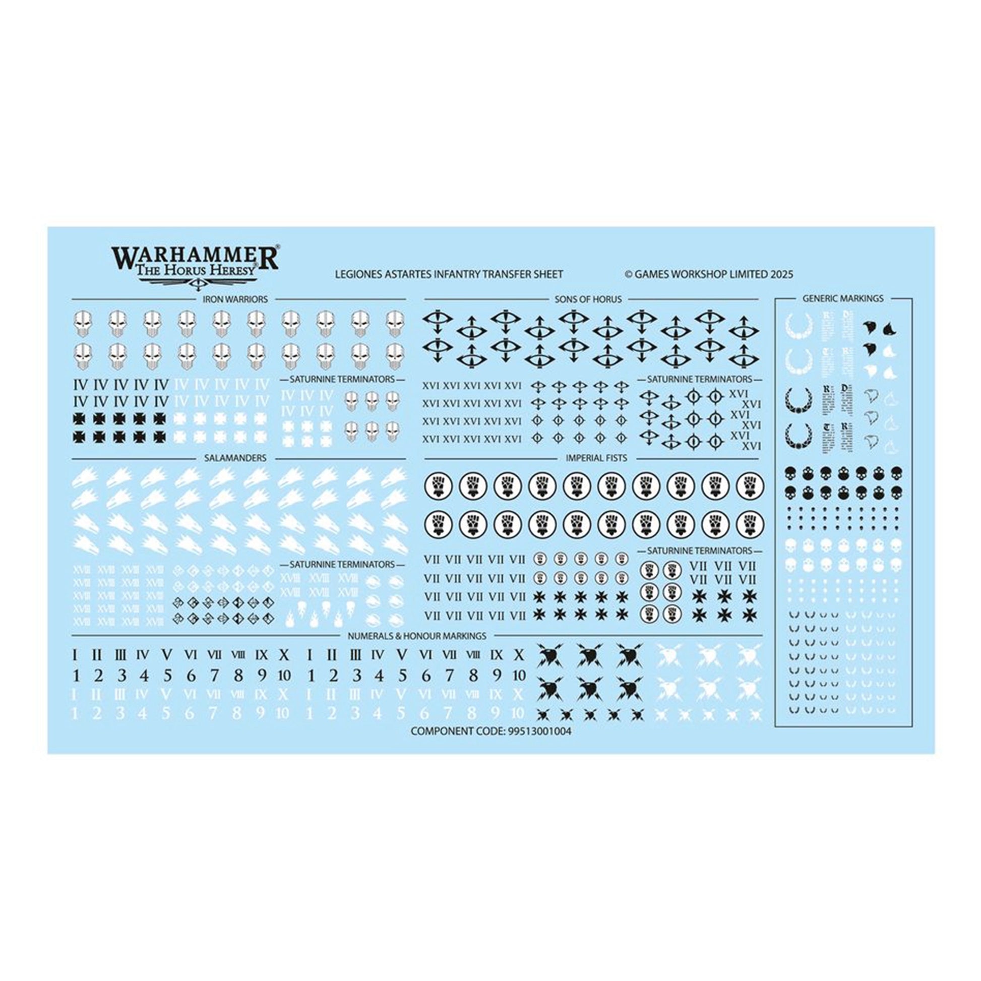 This kit comprises 224 plastic components, 4x Citadel 50mm Round Bases, and 1x Legiones Astartes Infantry Transfer Sheet containing 618 high-quality waterslide transfers – featuring Legion iconography for the Sons of Horus, Imperial Fists, Iron Warriors, and Salamanders – to decorate your miniatures.