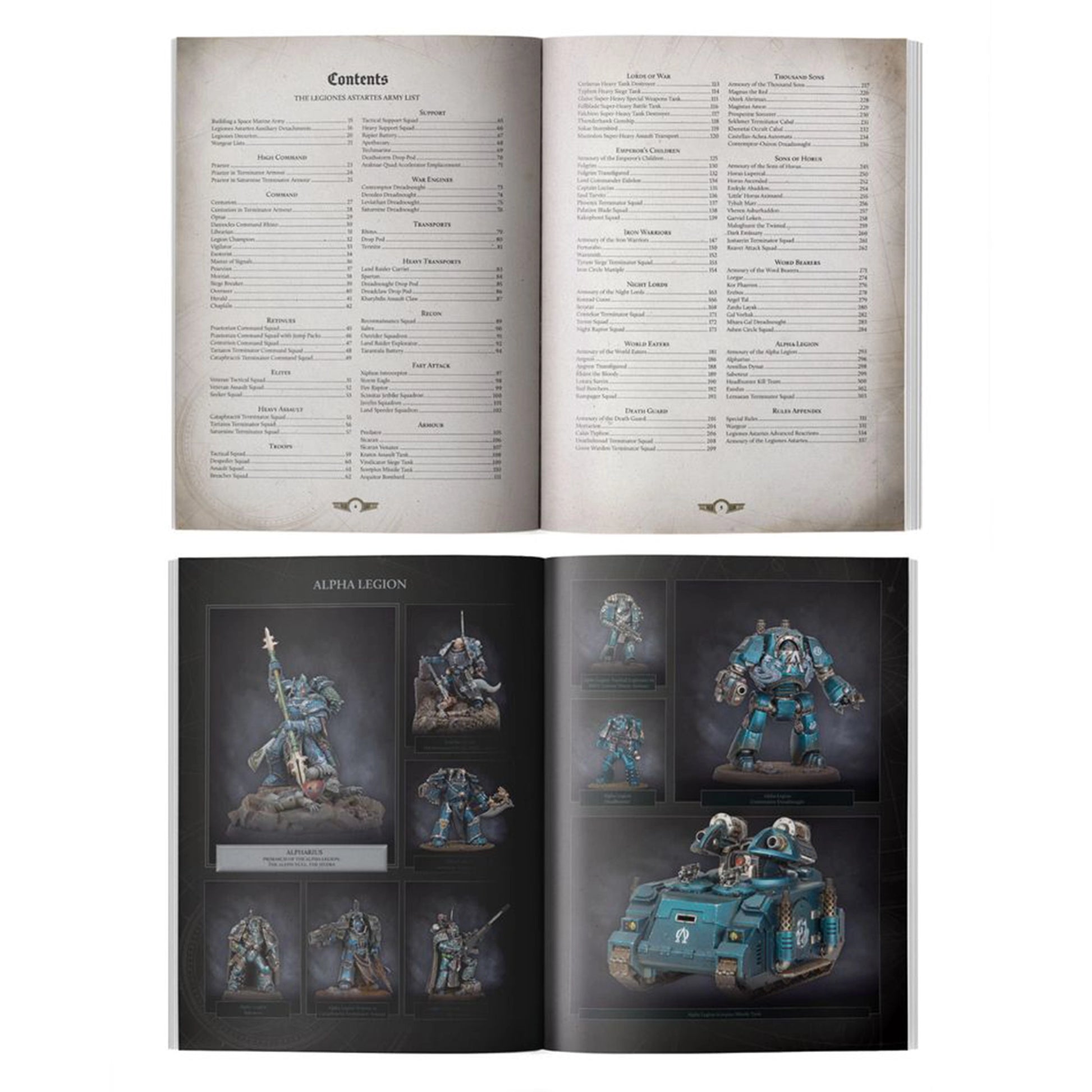 – Legion-specific special rules: Unit profiles, Detachments, Gambits, Wargear, Faction Abilities and Reactions for each of the Traitor Legions: the Emperor's Children, Iron Warriors, Night Lords, World Eaters, Death Guard, Thousand Sons, Sons of Horus, Word Bearers, and Alpha Legion.