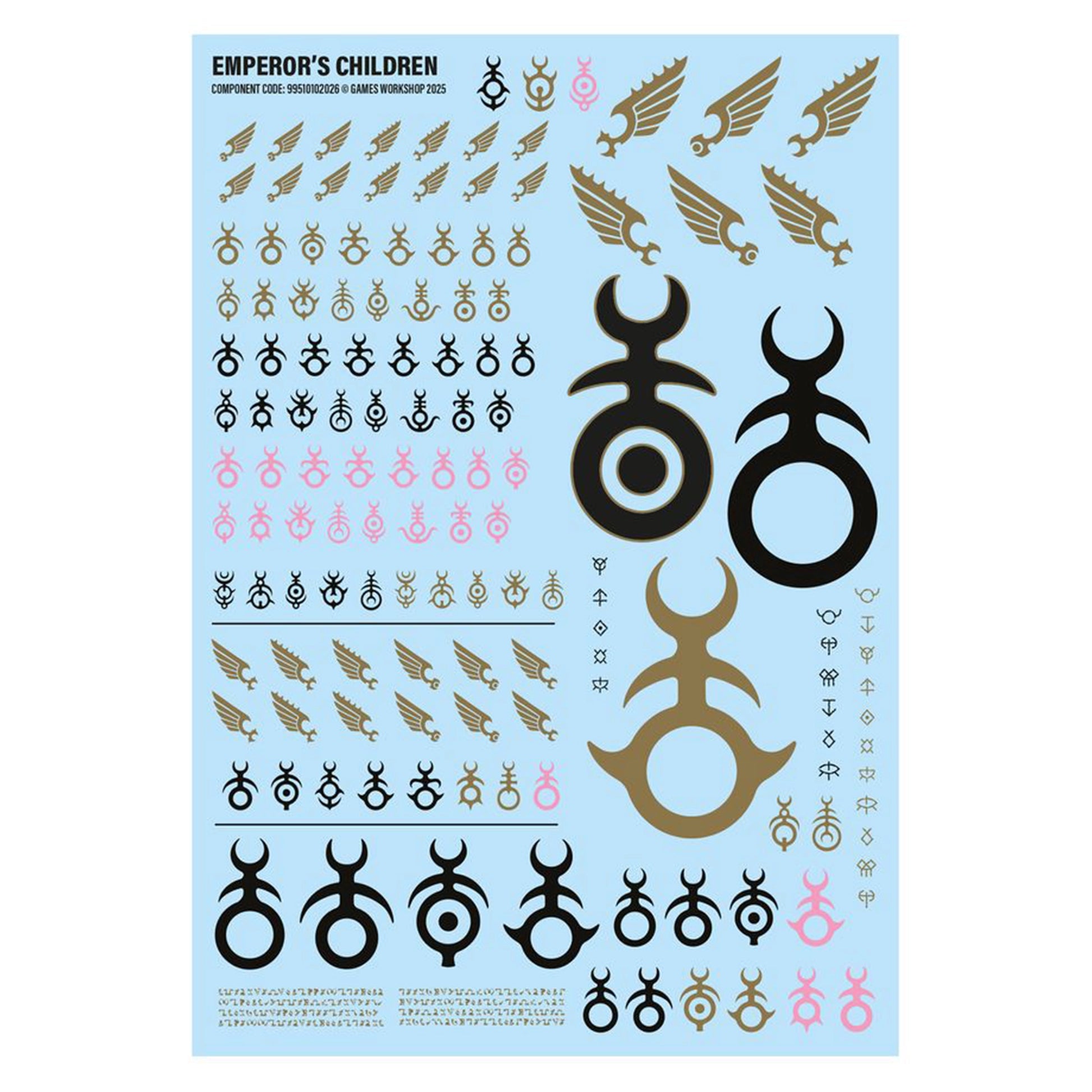 This kit is supplied with 4x Emperor’s Children Transfer Sheets, each containing 150 high-quality waterslide transfers to decorate your miniatures. These include Emperor’s Children symbols in a variety of colours and sizes, plus a selection of twisted Slaaneshi runes and script.