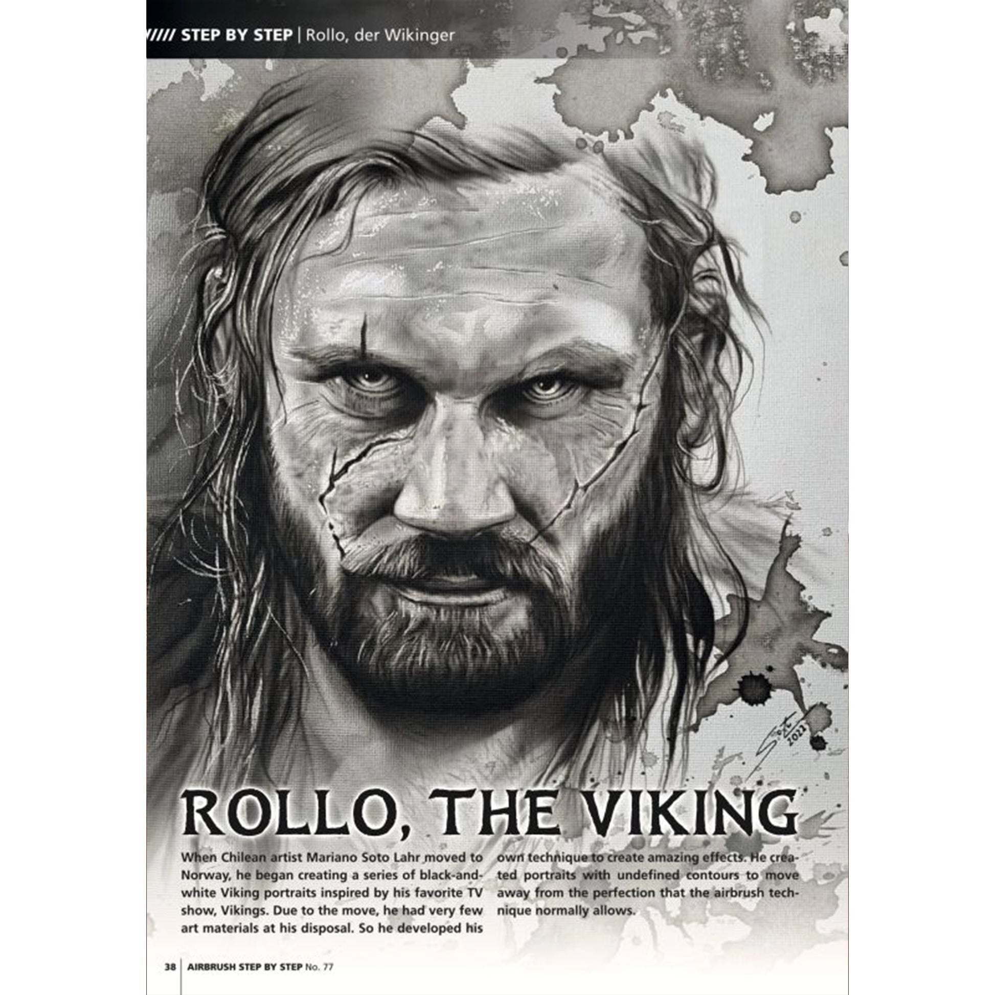 Mariano Soto Lahr developed his own technique for a series of black-and-white Viking portraits to create astonishing effects with just a few materials. With undefined contours, the portrait departs from the perfection usually associated with the airbrush technique.
