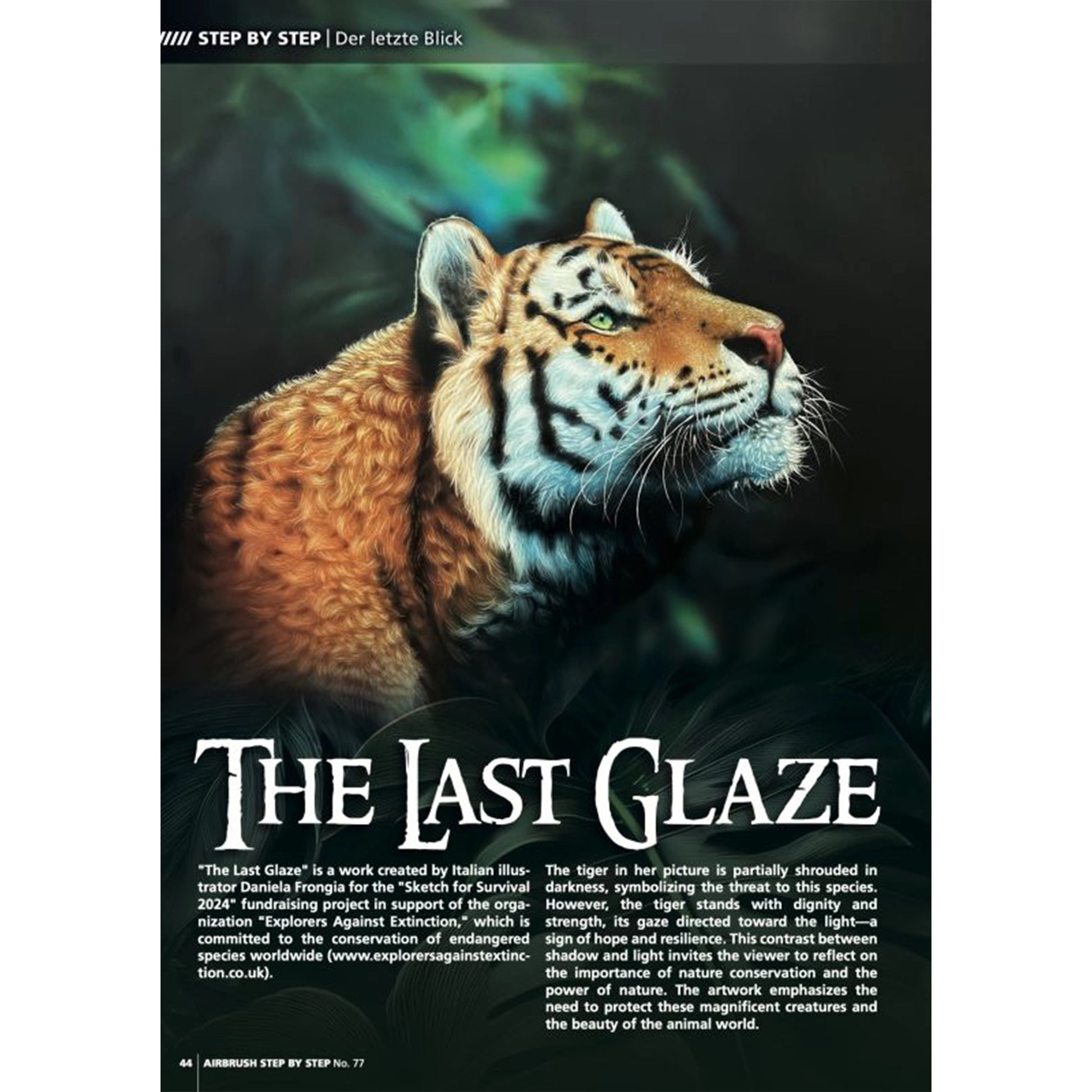 Italian Daniela Frongia painted this piece for a fundraising project to protect endangered species. Light and shadow in the picture symbolize both threat and hope for the tiger.