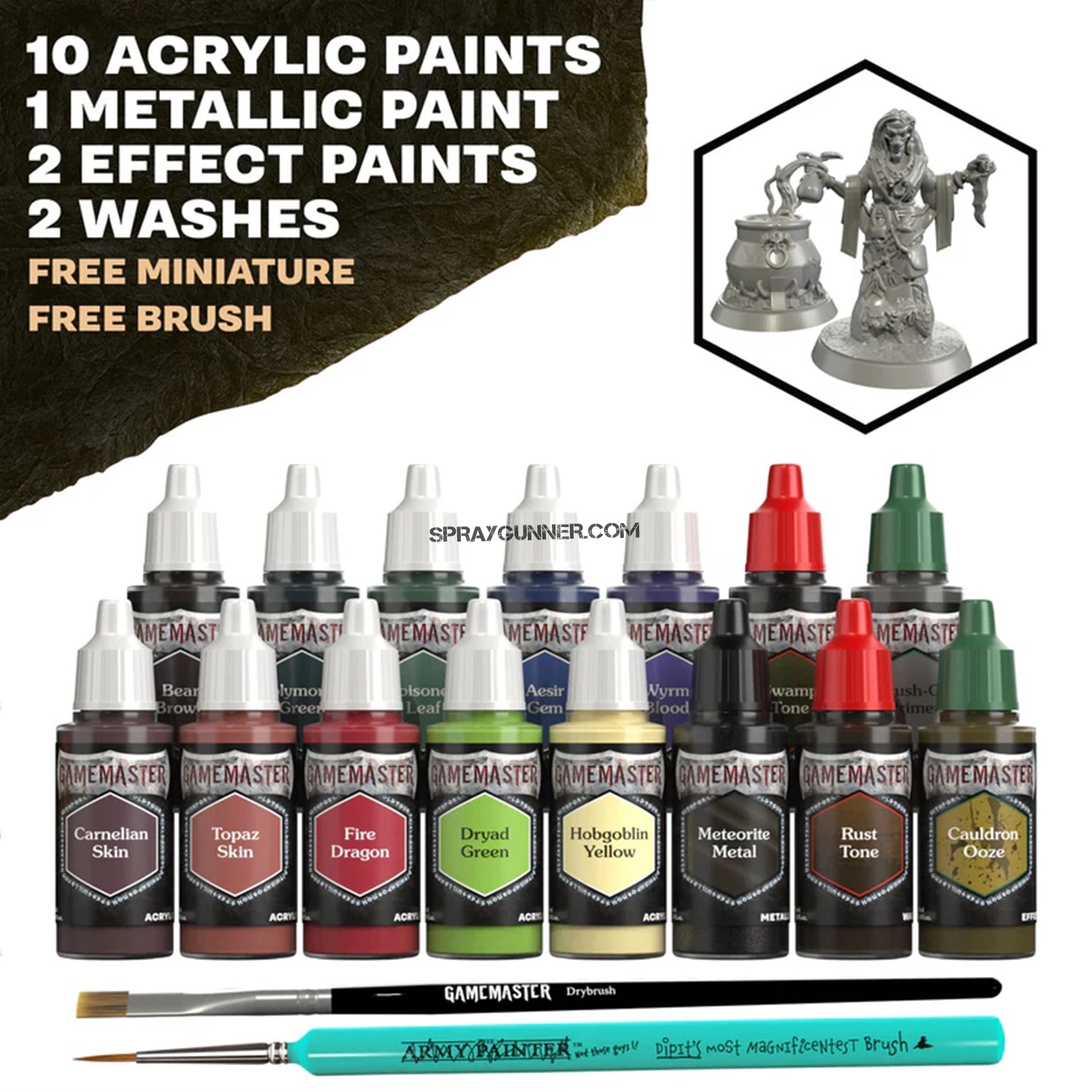 The GameMaster: Wilderness Adventures Role-Playing Paint Set includes 15 paints, consisting of 10 vibrant colours, 2 Effect paints, 1 Metallic paint, and 2 versatile Washes – all specially selected to go with the Wilderness theme. You also get a Painting Guide, a GameMaster: Drybrush, Dipit brush and a snap-fit cauldron and hag miniature – FREE!