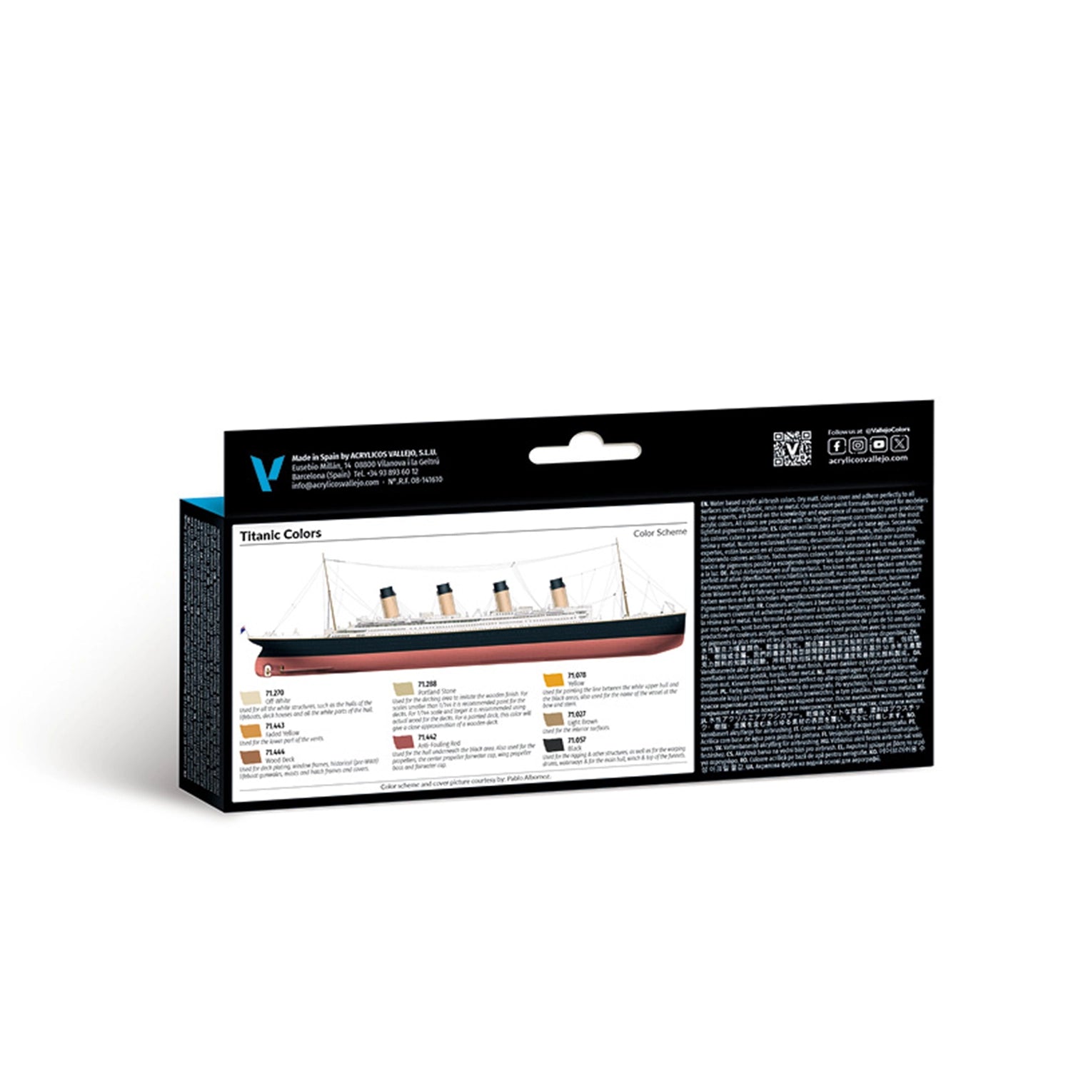 The set includes 8 references from the Model Air range in 17 ml bottles. Suitable for painting the scale model of the Titanic, offering the most suitable and correct shades based on the latest research and historical sources. For example, the draught color below hull, which has often been represented in a dark red tone and, according to historical samples and records of the time, it was indeed a dark salmon hue similar to that used on the Queen Mary and other Olympic-class ships.