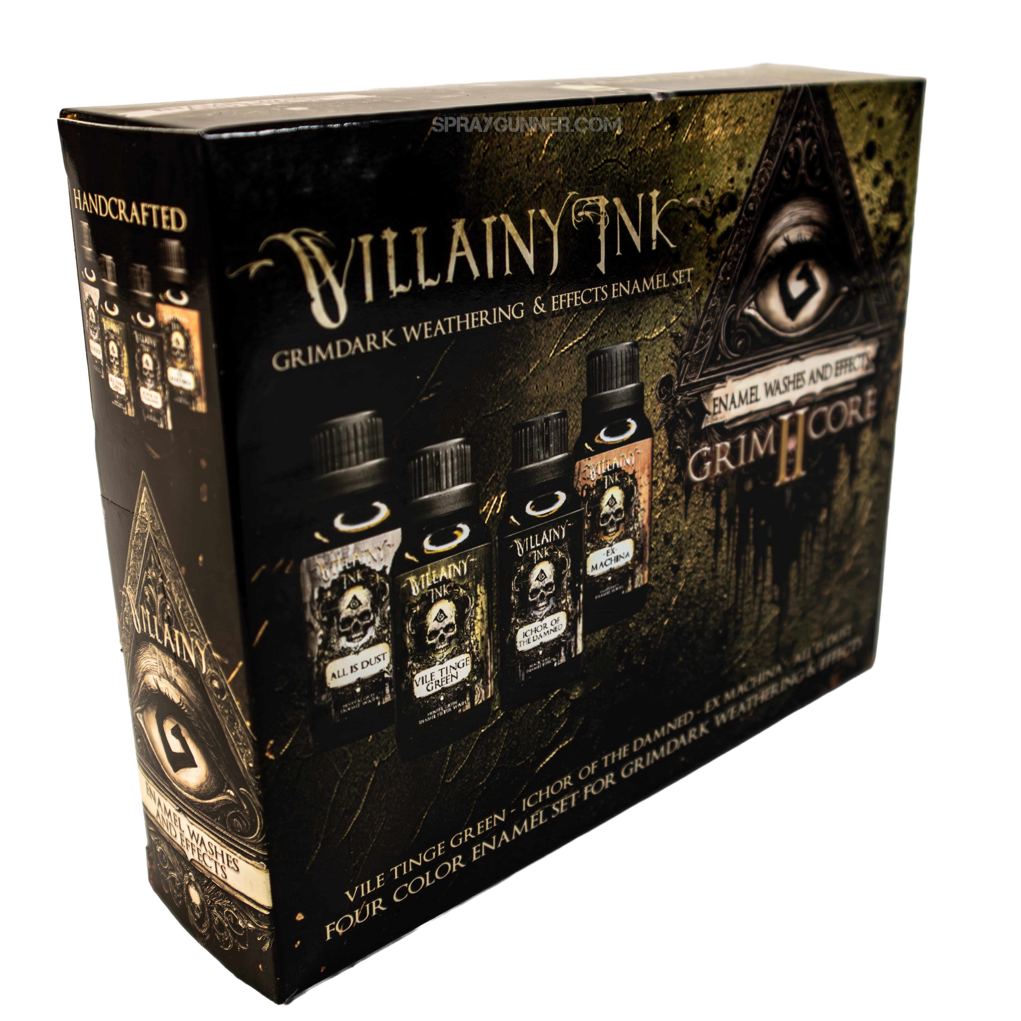 Master the grimdark style with Villainy Ink Enamels for Miniature Painting & Model Weathering. The Grim Core Set II includes four enamel washes formulated for creating weathering effects, pin washes, and streaking effects. Includes: